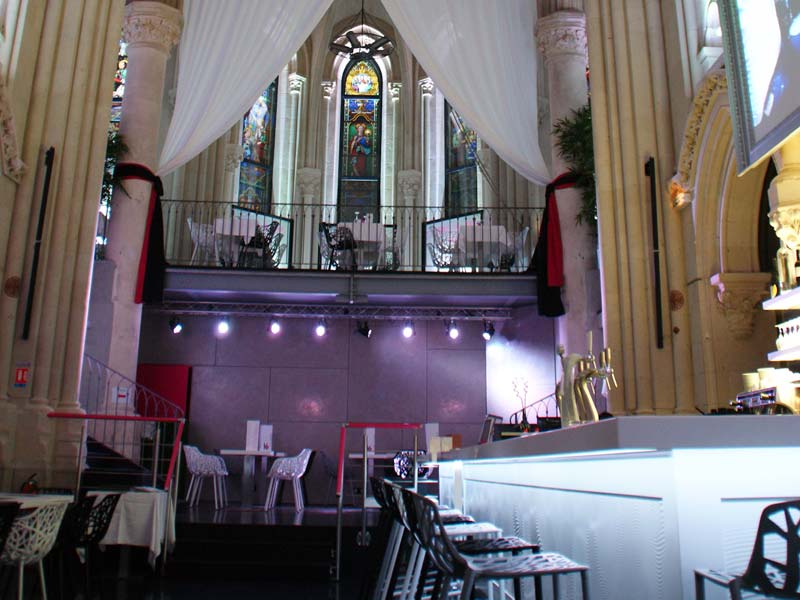 Cette ancienne église devait se transformer en restaurant et bar de nuit dans le respect de l’architecture initiale. L’ensemble de la Nef ainsi que les vitraux, les colonnes, les voutes ont été rénovés dans les règles de l’art afin de raviver les matériaux d’origine. Chaque réaménagement a été pensé afin de ne pas dénaturer le lieux et pour répondre aux normes exigées par la requalification du lieu.