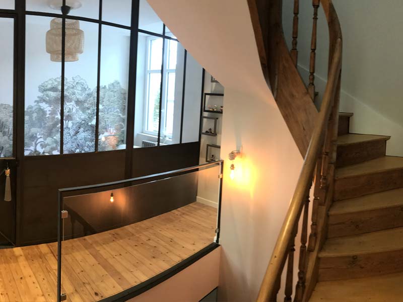 Les matériaux et la recomposition des volumes ont été défini en collaboration avec nos clients afin de redonner toute l’importance à la réorganisation afin d’exploiter au mieux chaque m². Une cours arrière inexploitable à donner place à une cuisine familiale lumineuse. Les sols en parquet ont entièrement été rénové ou bien remplacer. Les murs de l'ensemble de la maison ont été traité à la chaux pour redonner un aspect cossue. Enfin un jeux de verrière permet de matérialiser les espaces en laissant passer la lumière.